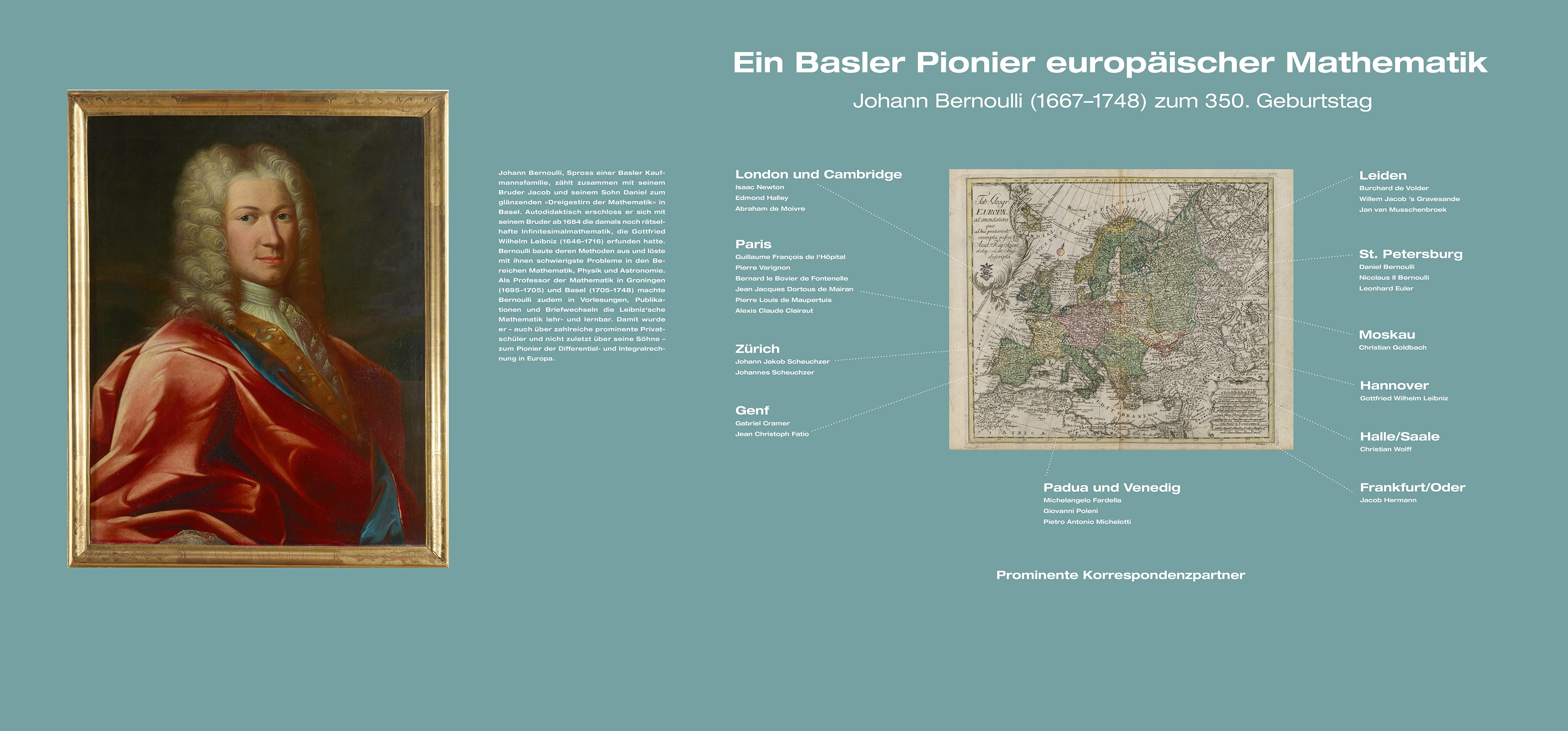 • im Historisches Museum Basel (8. Mai - 19. November 2017) "Ein Pionier europäischer Mathematik: Johann Bernoulli (1667-1748) zum 350. Geburtstag"